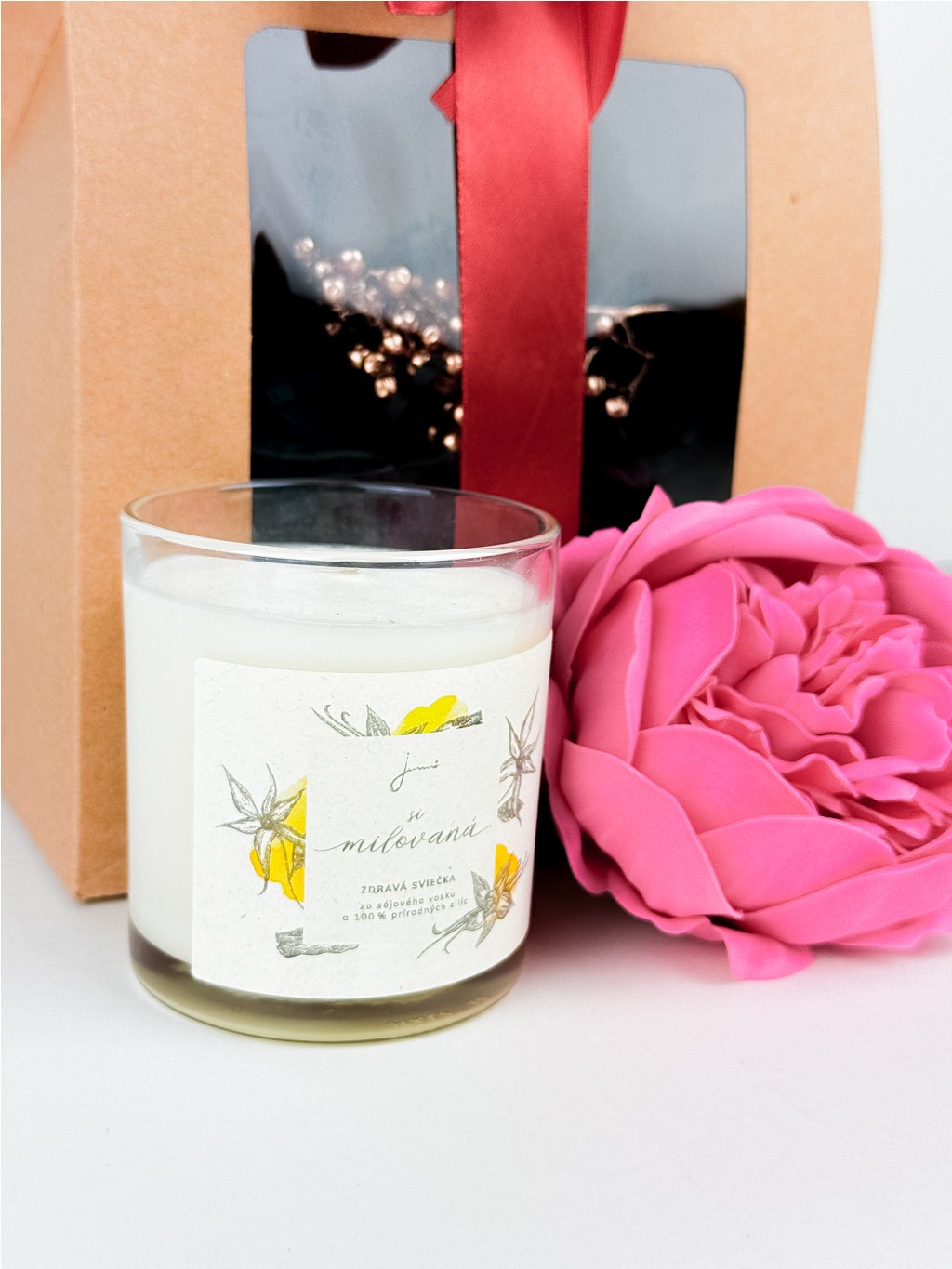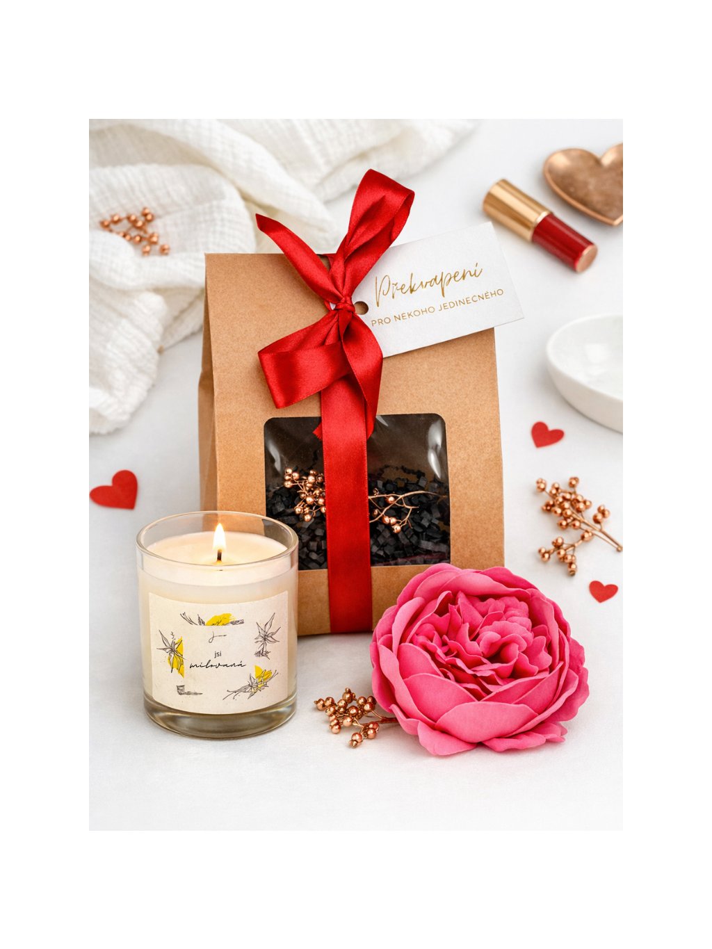 - Svíčku "Jsi milovaná" – aromatická svíčka ze sójového vosku, která vytváří útulnou a romantickou atmosféru. Její jemná vůně a krásný design budou připomínat obdarovanému, jak moc je milován