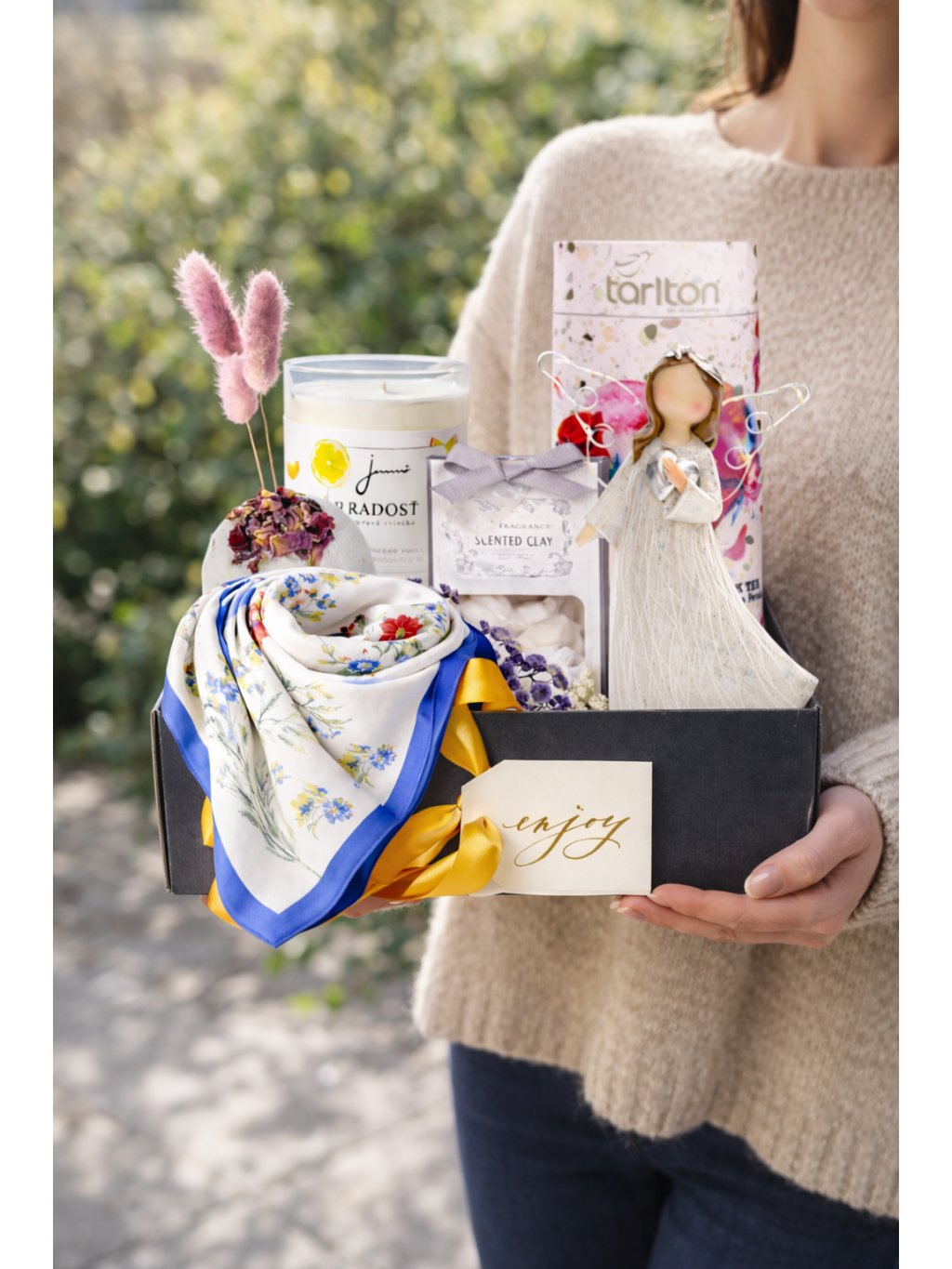 Krásný dárek pro ženy, který je naprosto nevšední a oslní každou ženu. Dárkovou krabičku jsme naplnili krásným andělíčkem se svítícími křídly, černým čajem Rose, šumivkou do koupele s růží, sójovou svíčkou Radost vonící po svěže po citrusech a krásně jemným šátkem s květy.