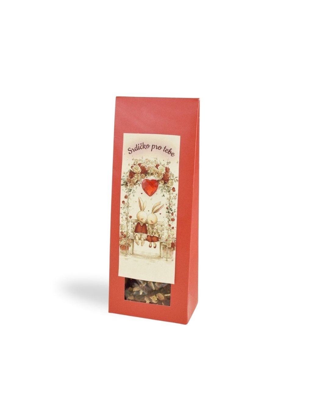 Ovocný čaj v dárkové krabičce s motivem zamilovaných zajíčků sedících na lavičce a dekorací srdíčka.