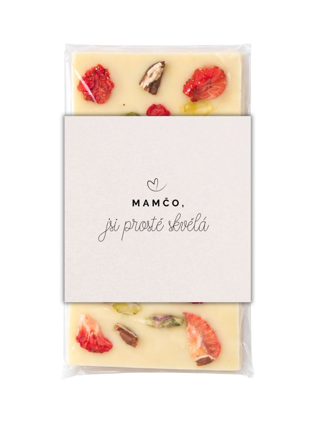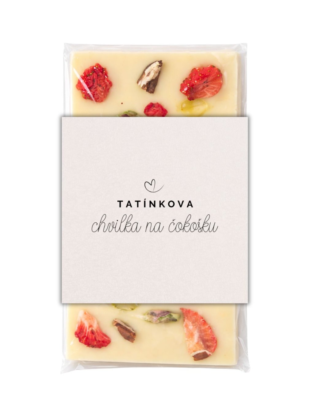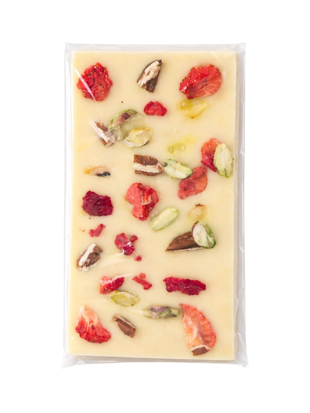 Kvalitní a poctivá bílá čokoláda s pekanovými ořechy, pistáciemi, kousky jahod a malin.
