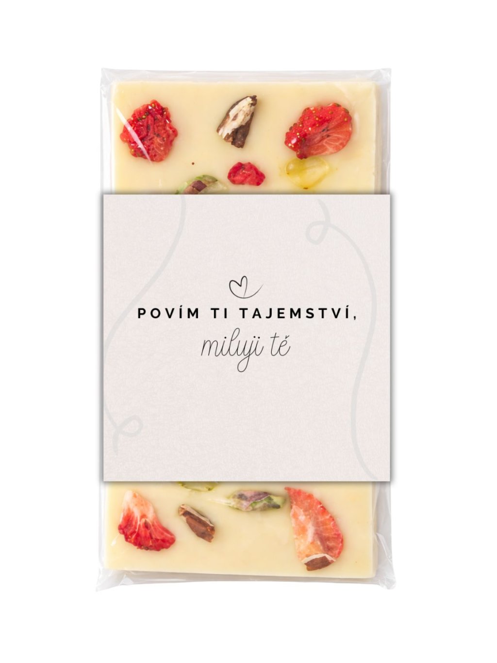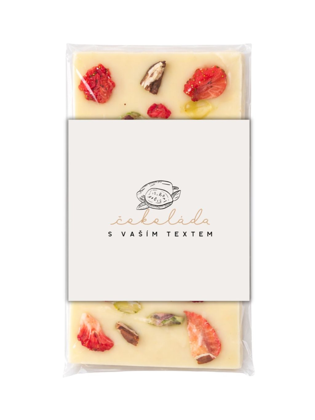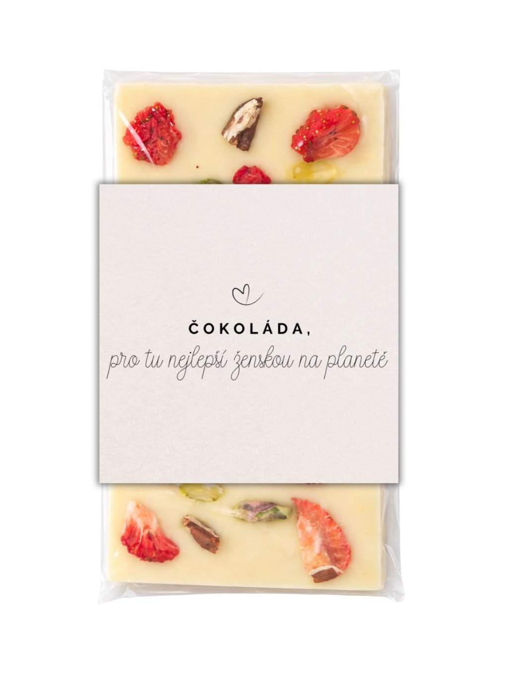 Kvalitní a poctivá bílá čokoláda s pekanovými ořechy, pistáciemi, kousky jahod a malin.