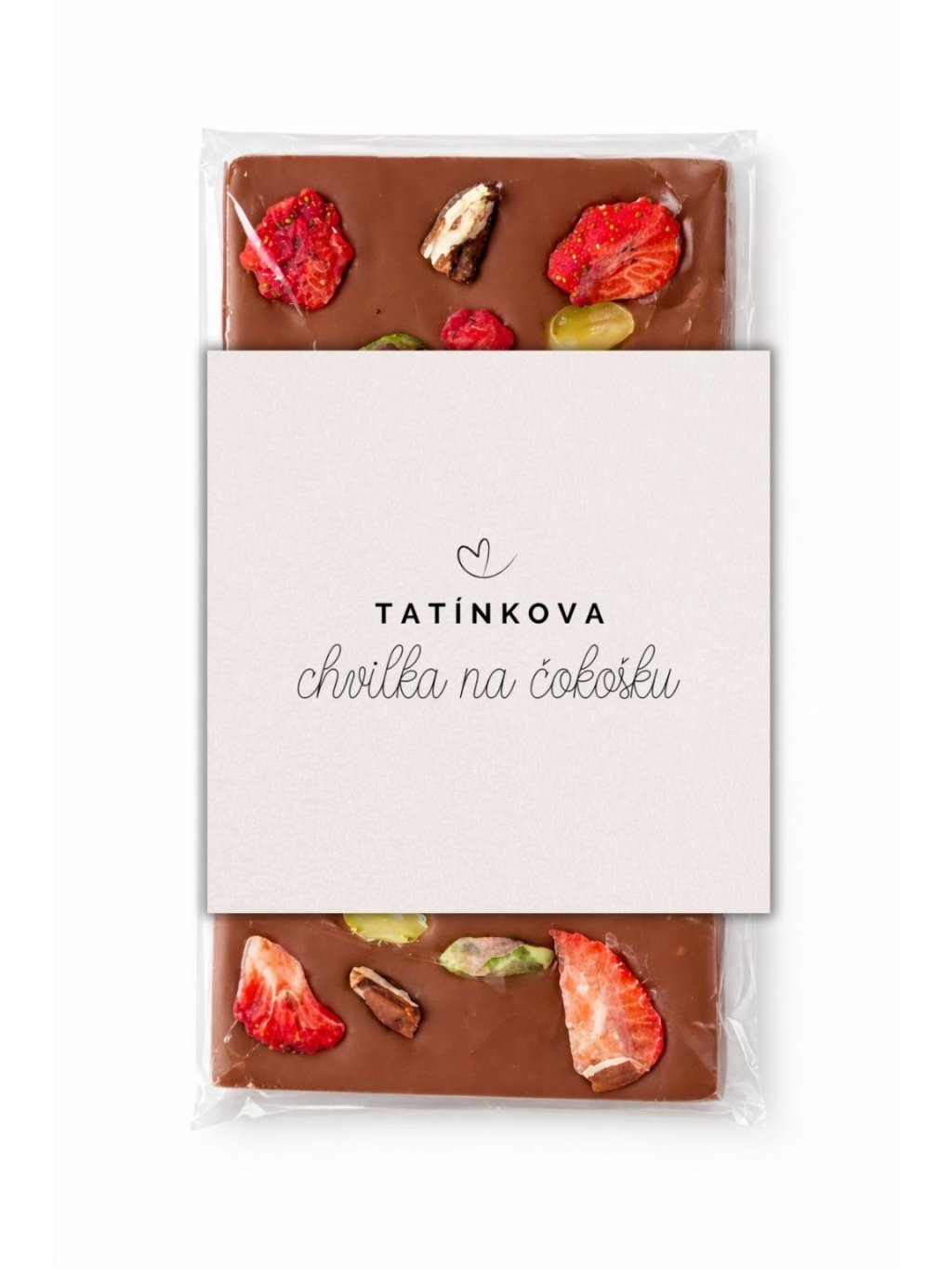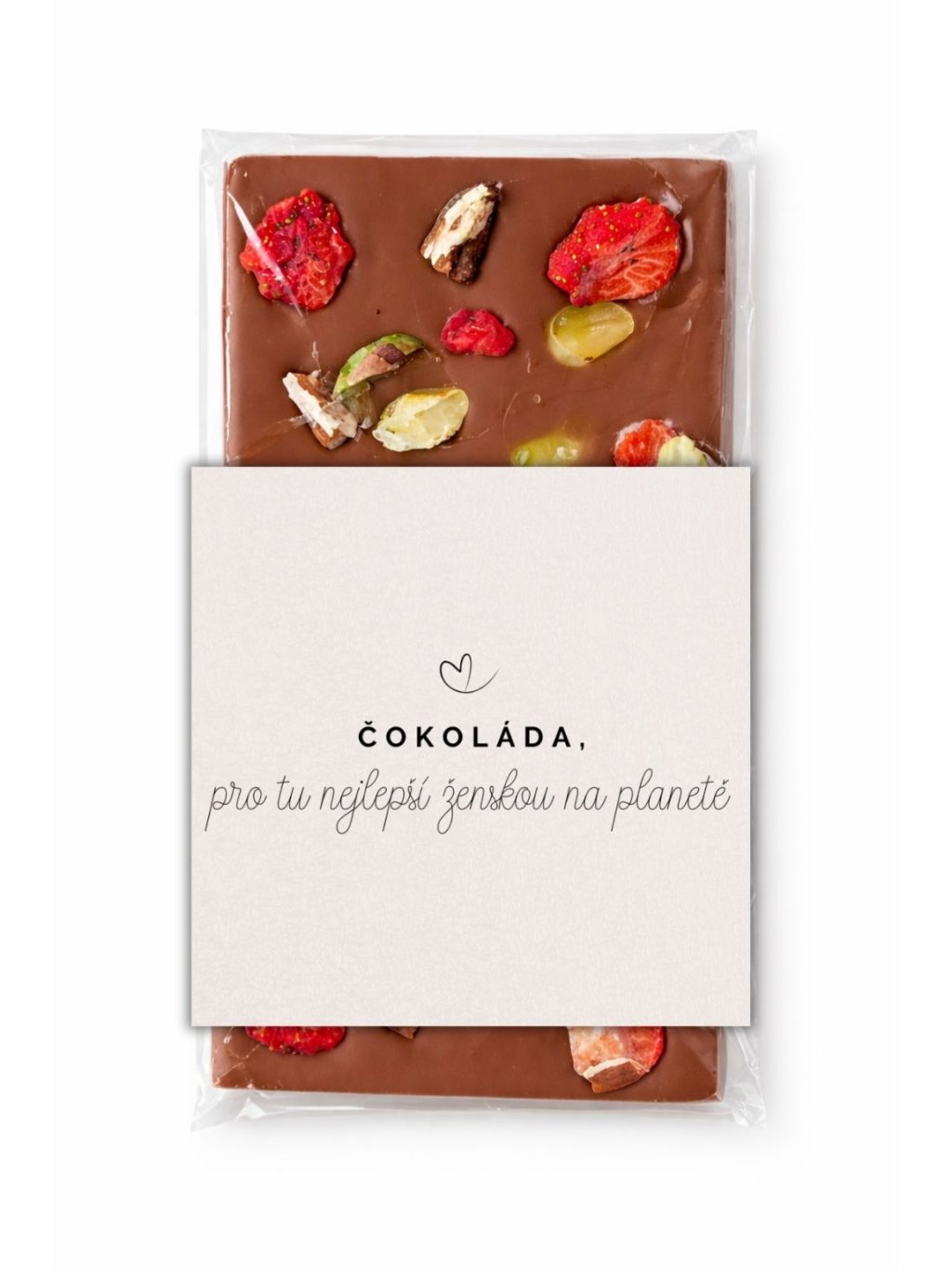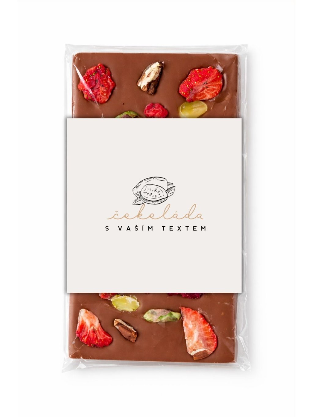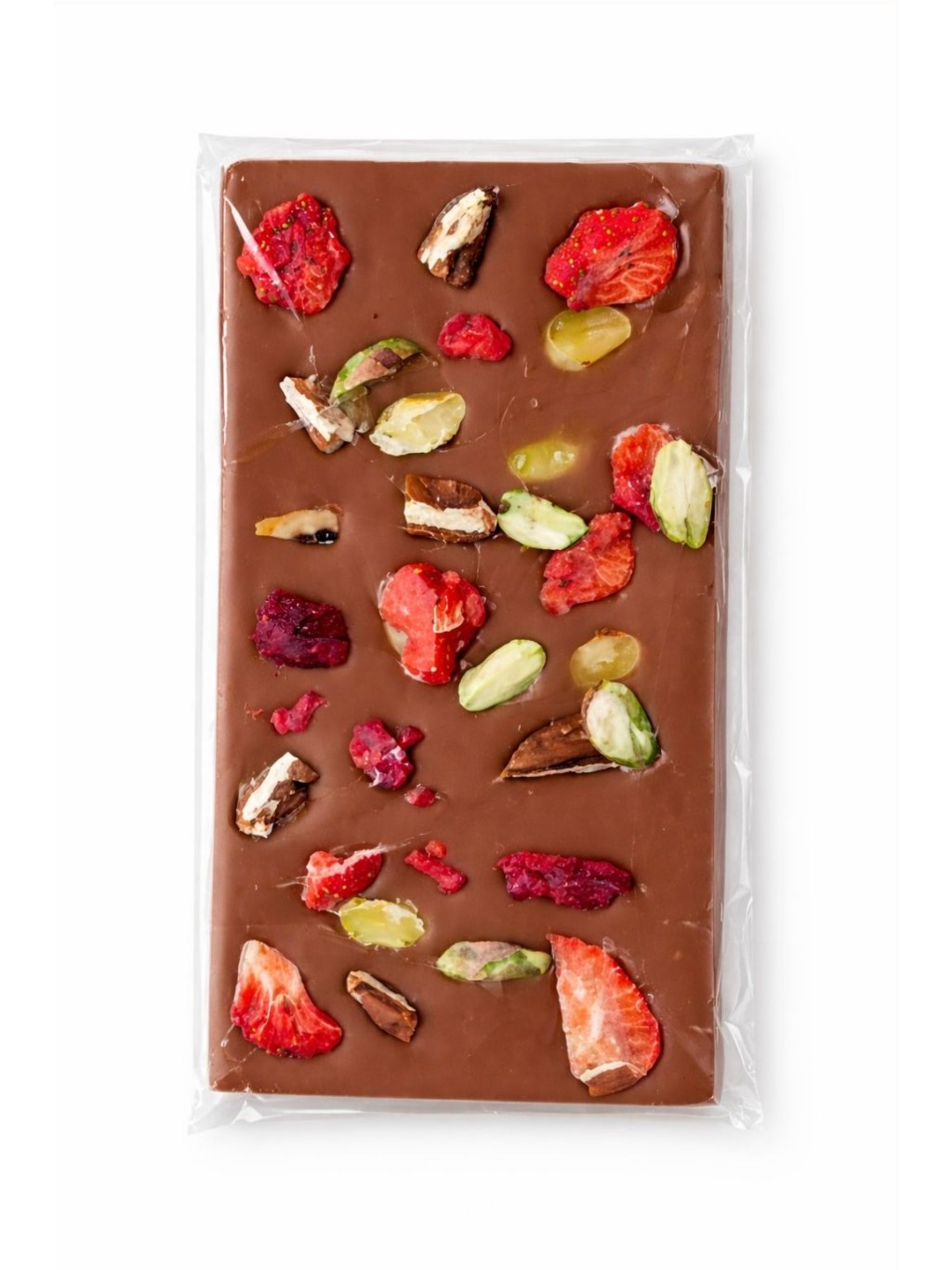 Kvalitní a poctivá mléčná čokoláda s pekanovými ořechy, pistáciemi, kousky jahod a malin.