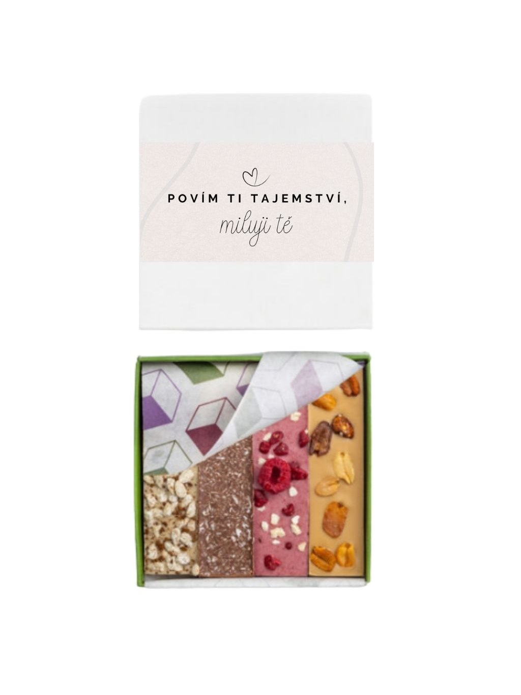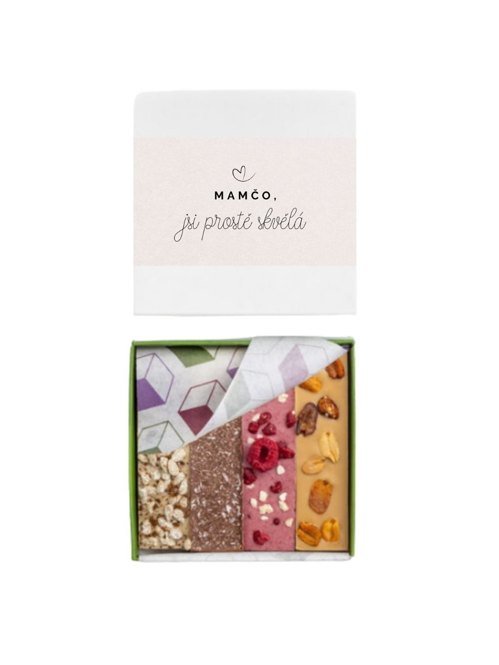 Obsahuje spojení mléčné čokolády a kokosu, mandlovou variantu s jogurtem a mandlemi a arašídový nugát s karamelizovanými arašídy. Posledním kouskem je chuťově výrazný kávový nugát se slunečnicovou chalvou. Který se stane vaším favoritem?