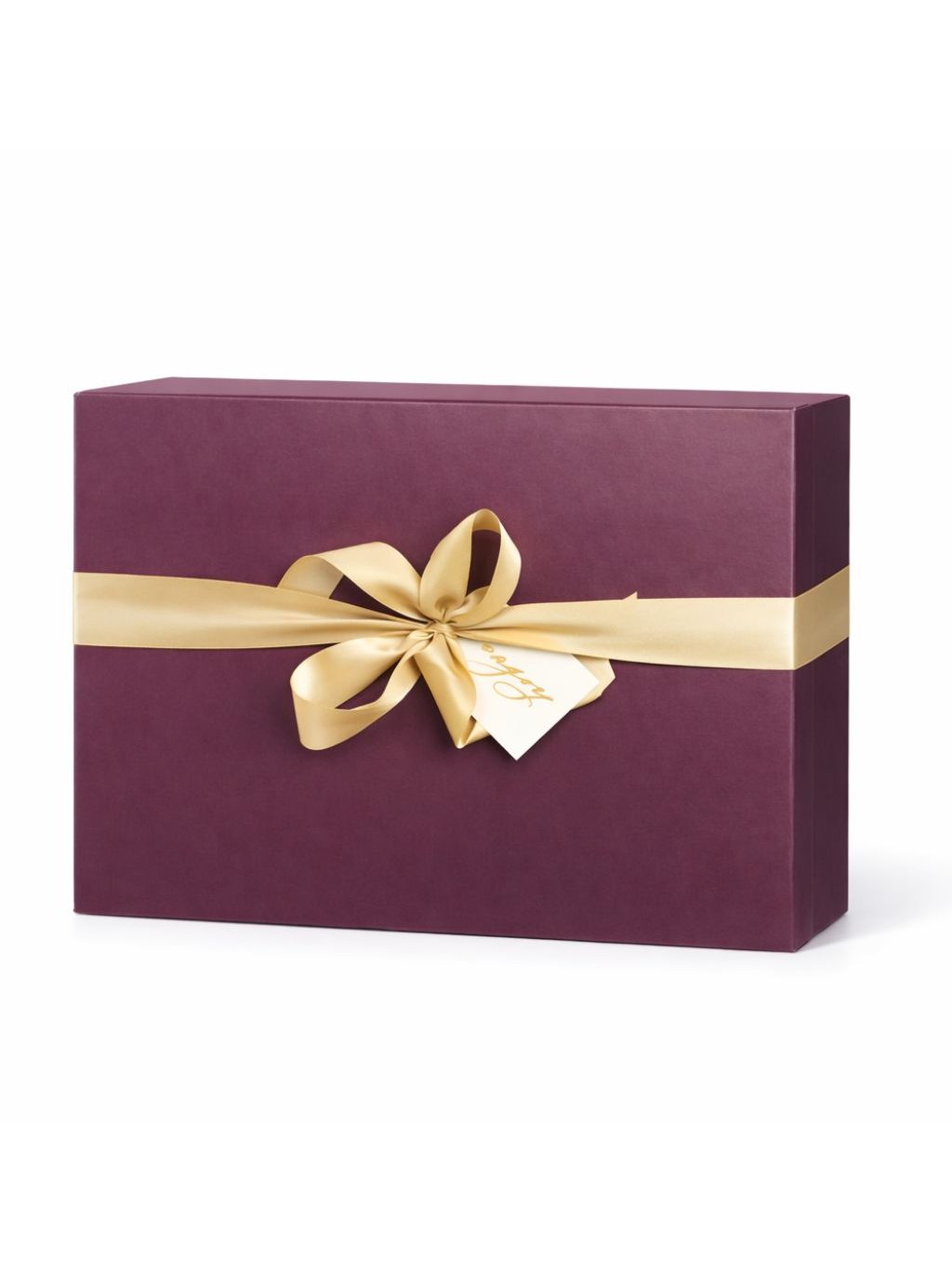 Dárková krabice ve vínové barvě převázaná saténovou mašlí. Krabičku lze následně využít v interiéru. Vhodná pro větší láhve - víno, prosecco.